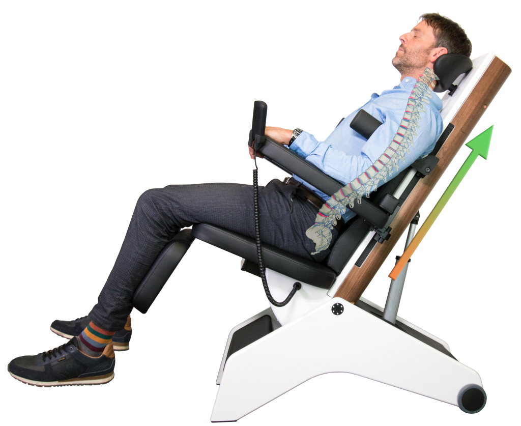 Der Entlastungsstuhl sorgt durch eine milde Dehnung der Wirbelsäule für eine maximale Entlastung der Bandscheiben.• Bandscheiben werden entlastet
